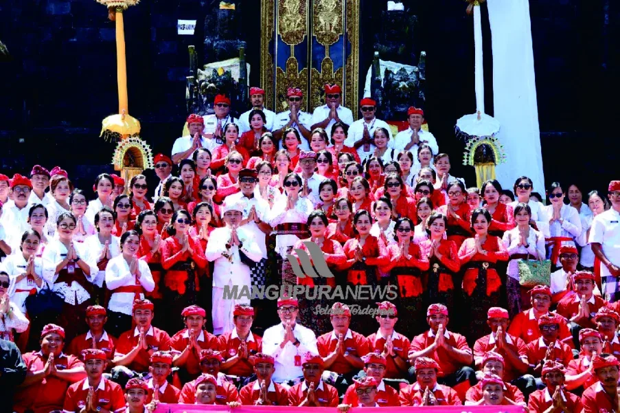 Dalam suasana yang penuh kekhidmatan, seluruh peserta rombongan menunjukkan kekompakan dan ketulusan dalam menjalani setiap tahapan upacara. Tak hanya hadir untuk bersembahyang, Bupati Sanjaya dan Bunda Rai dan jajaran juga aktif ngayah sebagai bentuk dukungan spiritual terhadap pelaksanaan karya agung tersebut.