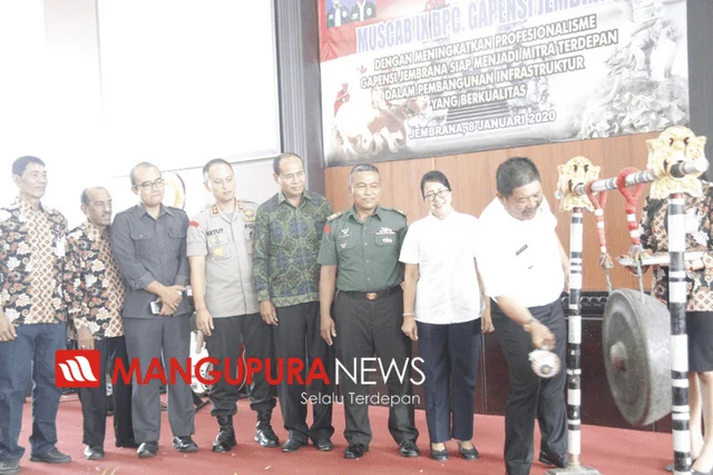 JEMBRANA, MANGUPURANEWS – Musyawarah Cabang(Muscab) IX DPC Gapensi ( Gabungan Pelaksana Kontruksi Nasional ) Kabupaten Jembrana diselenggarakan di Gedung Kesenian Bung Karno, Rabu(8/1). Dalam Muscab yang juga dihadiri ketua DPRD Kabupaten Jembrana, Ni Made Sutarmi, ketua Gapensi Propinsi Bali, I Wayan Sujana serta anggota Forum Pimpinan Daerah, Bupati I Putu Artha minta kepada para pengusaha dalam mengerjakan proyek-proyek di Kabupaten Jembrana untuk selalu berkompetisi menjaga kualitas. “selama ini proyek-proyek yang dikerjakan di Kabupaten Jembrana yang dikerjakan oleh para pengusaha saya lihat belum ada yang memuaskan. Artinya dari sisi kualitasnya masih belum optimal. Harus ditingkatkan , “ujar Artha.