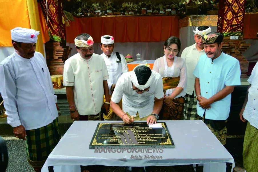 MANGUPURANEWS – BADUNG, Bupati Badung I Wayan Adi Arnawa didampingi didampingi Ketua TP. PKK Kabupaten Badung Nyonya Rasniathi Adi Arnawa menghadiri Tawur Agung serangkaian Karya Mamungkah, Ngenteg Linggih, Pedudusan Agung, Ngusaba Nini, berdasarkan Tawur Balik Sumpah Menawa Ratna serta menandatangani prasasti di Pura Ulun Swi, Banjar Dukuh Moncos, Desa Sobangan, Mengwi, Jumat (9/5).