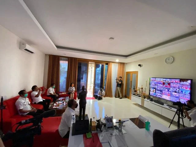 BADUNG, MANGUPURANEWS – Bupati Badung I Nyoman Giri Prasta bersama Wabup. I Ketut Suiasa dan Sekda Badung I Wayan Adi Arnawa mengikuti video conference (vidcon) yang diselenggarakan Kementerian Dalam Negeri (Kemendagri), Rabu (8/4) di Rumah Jabatan Bupati, Puspem Badung. Vidcon tersebut juga diikuti Ketua KPK RI, Ketua BPK RI, Kepala BPKP, Kepala LKPP dan Kabareskrim, Sekda Provinsi dan Bupati/Walikota se-Indonesia. Rapat membahas terkait akuntabilitas pelaksanaan anggaran dan pengadaan barang/jasa di daerah dalam pencegahan penyebaran dan percepatan penanganan Covid-19. Dalam rapat tersebut Bupati juga didampingi Inspektur Luh Suryanithi, Kepala BPKAD I Ketut Gede Suyasa, Kadiskominfo IGN Gede Jaya Saputra dan Kabag Humas Made Suardita.