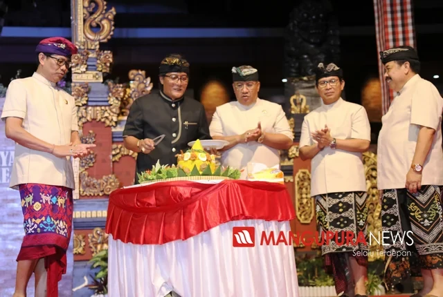 PEMKAB BADUNG, MANGUPURANEWS – Bupati Badung I Nyoman Giri Prasta menutup Festival Seni Budaya Kabupaten Badung XIII Tahun, sekaligus memperingati HUT Dasawarsa Kota Kabupaten Badung Mangupura, di panggung Terbuka Balai Budaya Giri Nata Mandala Puspem Badung, Sabtu (16/11) yang ditandai dengan pemotongan tumpeng.