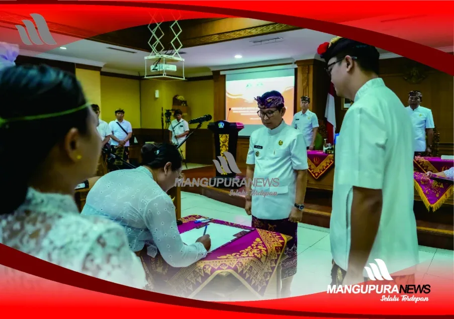 MANGUPURANEWS – PUSPEM BADUNG, Bupati Badung I Wayan Adi Arnawa melantik dan mengambil sumpah jabatan Pejabat Administrator, Pejabat Pengawas dan Pejabat Fungsional di lingkungan Pemkab Badung di ruang Kriya Gosana, Puspem Badung, Kamis (14/8). Sebanyak 61 pejabat dilantik, terdiri dari Pejabat Administrator dan Pejabat Pengawas sebanyak 18 orang dan Pejabat Fungsional 43 orang. Khusus pejabat administrator dan pengawas ditugaskan untuk mengisi jabatan di RSUD Giri Asih di Abiansemal dan RSUD Suwiti di Petang. Sebagai Direktur RS Giri Asih dipercayakan kepada dr. Ni Luh Ketut Ayu Ratnawati, M.Kes yang sebelumnya menjabat Kabid Pelayanan Kesehatan Dinas Kesehatan dan dr. I Ketut Sukerta yang sebelumnya sebagai Dokter Madya UPTD Puskesmas Petang II menjabat Direktur RSUD Suwiti.