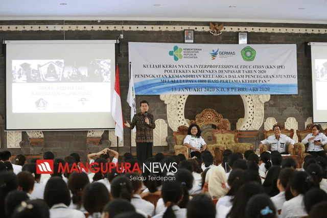 KLKUNGKUNG, MANGUPURANEWS – Bupati Klungkung, I Nyoman Suwirta didampingi Kepala Dinas Kesehatan Kabupaten Klungkung Ni Made Adi Swapatni menjadi Narasumber Kuliah Kerja Nyata Interprofessional Education (KKN IPE) Tahun 2020 di Gedung Auditorium Poltekkes Kemenkes, Denpasar, Rabu (15/1/2020) Siang. Kegiatan ini untuk memberikan pembekalan sekaligus memperkenalkan Kota Klungkung dibidang pelayanan kesehatan kepada mahasiswa yang akan melaksanakan (KKN) di Kabupaten Klungkung. Turut hadir Direktur Poltekkes Kemenkes Denpasar Anak Agung Ngurah Kusumajaya, SP., MPH, Wakil Direktur I Poltekkes Denpasar Gusti Ayu Marhaeni. SKM.. M.Biomed serta para mahasiswa.