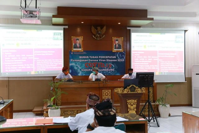 KLUNGKUNG, MANGUPURANEWS – Bupati Klungkung, I Nyoman Suwirta didampingi Sekda Klungkung, I Gede Putu Winastra dan Kadisos Klungkung, Ida Bagus Anom Adnyana mengikuti teleconference Gubernur, Bupati/Walikota se-Indonesia dengan Kementerian Sosial dari ruang rapat Praja Mandala, Kantor Bupati Klungkung, Kamis, (16/4). Rapat dipimpin Menteri Sosial, Juliari P. Batubara di Jakarta dengan materi terkait Bantusan Sosial (Bansos) Tunai yang diberikan kepada masyarakat dalam rangka pencegahan dampak Covid-19.