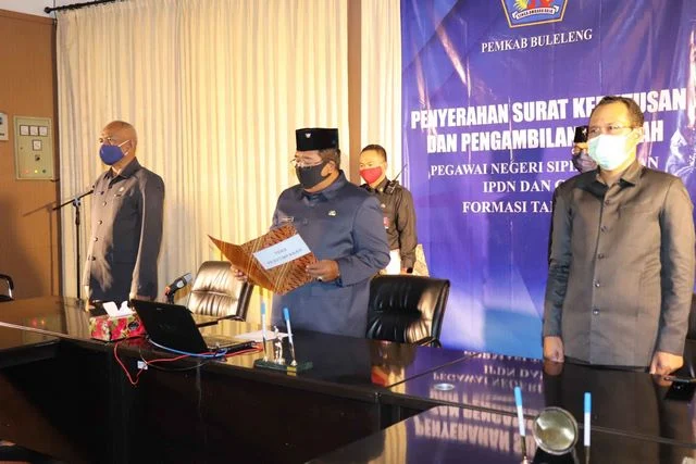 PNS tersebut terdiri dari 313 orang CPNS formasi umum di Buleleng tahun 2018 dan lima orang lulusan Institut Pemerintahan Dalam Negeri (IPDN). Pelantikan dan pengambilan sumpah dipusatkan di Ruang Rapat Lobi Kantor Bupati Buleleng, Selasa (14/4) dengan diikuti empat perwakilan di tempat dan 313 lainnya mengikuti melalui video conference.