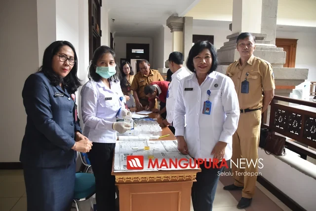 PUSPEM BADUNG, MANGUPURANEWS – Dalam rangka mendukung terciptanya Aparatur Sipil Negara (ASN) di Dinas Kearsipan dan Perpustakaan Kabupaten Badung yang bersih dari narkoba, maka Badan Narkotika Nasional (BNN) Kabupaten Badung mengadakan tes urine bagi 60 orang yang terdiri dari pejabat dan ASN di Dinas Kearsipan dan Perpustakaan Kabupaten Badung, di kantor setempat, Senin, (4/11).
