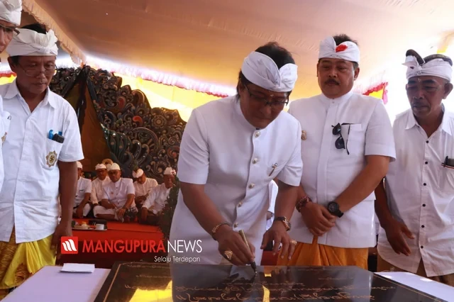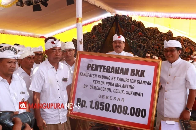 Pada kesempatan tersebut Bupati Giri Prasta dan Wakil Bupati Gianyar Anak Agung Mayun melakukan persembahyangan bersama serta menandatangani prasasti karya sekaligus menyerahkan bantuan dana Bantuan Keuangan Khusus (BKK) sebesar Rp. 1,050 M, terdiri dari untuk pembangunan fisk pura yang sudah terealisasi sebesar Rp. 550 juta dan dana aci/upakara Rp. 500 juta.