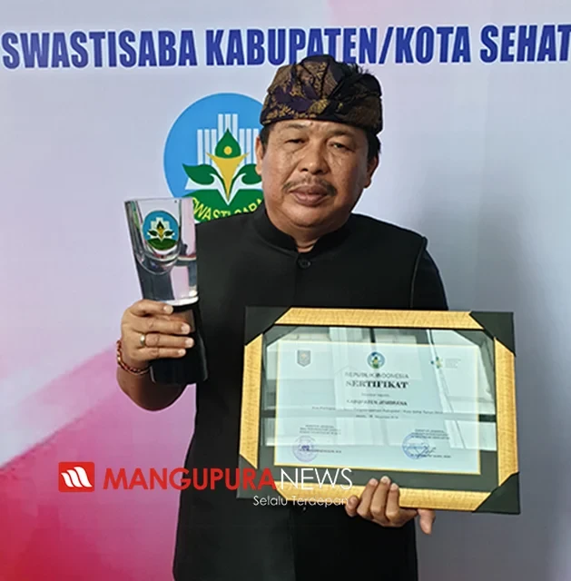 JAKARTA, MANGUPURANEWS – Jelang akhir tahun, Kabupaten Jembrana berhasil menyabet satu lagi penghargaan nasional, Kabupaten Jembrana dinobatkan sebagai salah satu kota sehat dibali, ditandai dengan pemberian penghargaan swasti saba padapa sebagai kabupaten/kota sehat tahun 2019. Penghargaan diserahkan Menteri Dalam Negeri RI, Tito Karnavian kepada Bupati Jembrana I Putu Artha, bertempat di Ruang Sasana Bhakti Praja Kemendagri, Jakarta, Selasa ( 18/11). Turut mendampingi Kepala Bappeda Litbang Jembrana I Ketut Swijana selaku Ketua tim teknis pembina Kota sehat serta Kadis Kesehatan Jembrana dr I Putu Suasta.