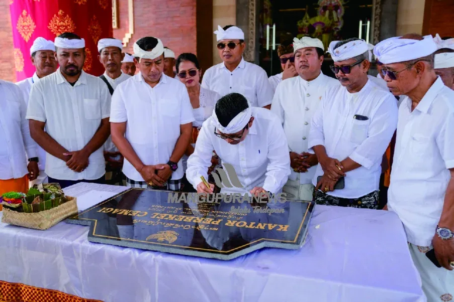 MANGUPURANEWS – BADUNG, Bupati Badung I Wayan Adi Arnawa menghadiri Karya Ngenteg Linggih Pedudusan Alit Kantor Perbekel Desa Cemagi, pada Sabtu (12/7). Dalam kesempatan tersebut Bupati menandatangani Prasasti yang dilanjutkan meninjau ruang kerja dan penyerahan secara simbolis Dana BKK Pembangunan Kantor sebesar Rp 3 miliar lebih.