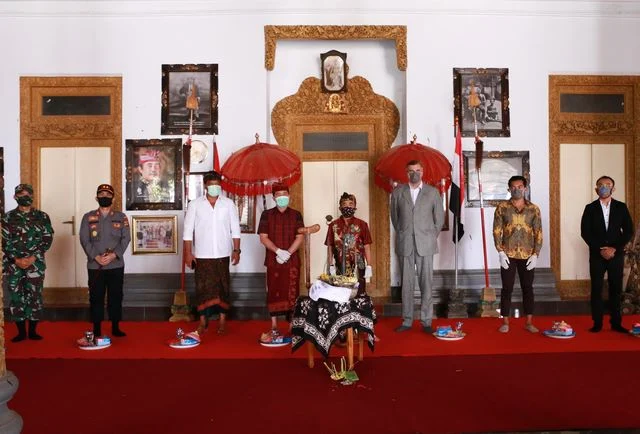 KLUNGKUNG, MANGUPURANEWS – Bertepatan dihari Puputan Klungkung ke-112 dan Hut Kota Semarapura ke-28, Kabupaten Klungkung menerima Tombak dan Kriss dari Yayasan Westerleker, Belanda yang diserahkan oleh Ketua Yayasan Westerleker, Rodney pada Selasa, (28/4/2020) Pagi. Benda Pusaka tersebut diserahkan Ketua Yayasan kepada Ida Dalem Semaraputra selanjutnya Benda Pusaka itu dititipkan kepada Pemkab untuk dijaga dan dirawat. Turut hadir Bupati Klungkung I Nyoman Suwirta, Ketua DPRD Kabupaten Klungkung A. A Gede Anom serta Forkopinda Kabupaten Klungkung.