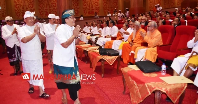 PUSPEM BADUNG, MANGUPURANEWS – Paruman Agung Dharma Ghosana se-Nusantara tahun 2019 dilaksanakan di Kabupaten Badung dihadiri Ida Pedanda Siwa dan Buda Kabupaten Kota se-Bali, Penglisir Puri se Bali, Dharma Ghosana Lombok dan Dharma Ghosana Jabodetabek bertempat di Gedung Giri Nata Mandala Puspem Badung, Minggu (27/10). Acara ini dihadiri Bupati Badung I Nyoman Giri Prasta di dampingi Ketua DPRD Kabupaten Badung I Putu Parwata, Ketua Harian Dharma Gosana Dharmopadesa Pusat Ida Pedanda Gede Jelantik Dwaja, Ketua Harian Dharma Prawerti Sabha Dharmopadesa Kabupaten Badung Ida Pedanda Putra Pasuruan, Kepala Kementrian Agama Kabupaten Badung A.A. Manguningrat, Ketua PHDI Badung, Camat Mengwi I Gst. Ngurah. Jaya Saputra dengan Tripikanya dan para tokoh umat sedharma.