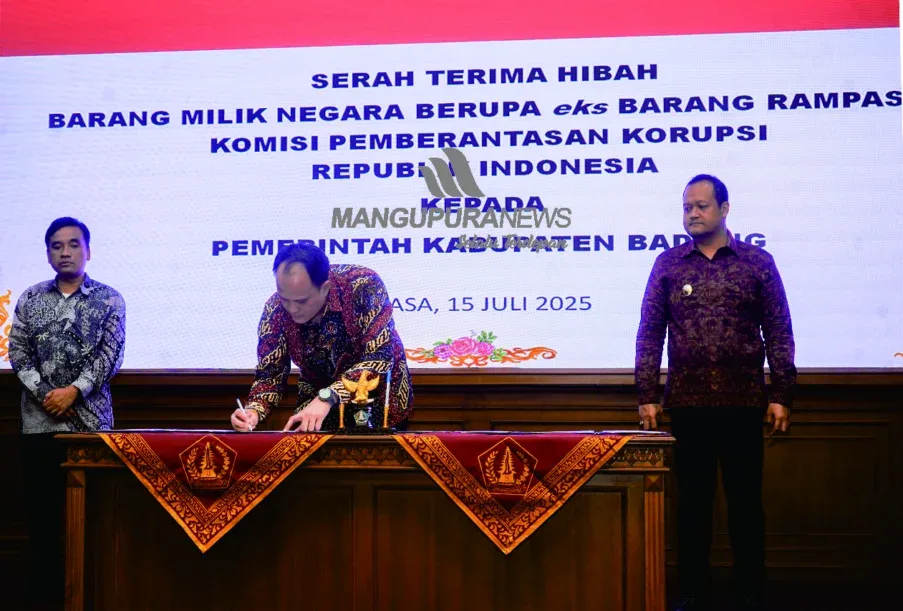 MANGUPURANEWS – PUSPEM BADUNG, Pemkab. Badung menerima hibah Barang Milik Negara (BMN) berupa eks barang rampasan dari Komisi Pemberantasan Korupsi Republik Indonesia (KPK RI). Hibah berupa tanah barang sitaan KPK RI ini terletak di Kelurahan Kerobokan Kelod, Kecamatan Kuta Utara, terdiri dari 6 (enam) bidang tanah dengan total nilai Rp 26 miliar lebih. Acara serah terima hibah BMN, dirangkaikan dengan Sosialisasi Anti Korupsi di Ruang Kertha Gosana, Puspem Badung, Selasa (15/7). Hibah BMN diserahkan oleh Direktur Pelacakan Aset, Pengelolaan Barang Bukti dan Eksekusi (Labuksi) KPK RI Mungki Hadipratikto, diterima Wakil Bupati Badung Bagus Alit Sucipta. Hadir Ketua DPRD Badung I Gusti Anom Gumanti, Wakil Ketua DPRD I Made Sunarta, Forkopimda Badung, Sekda Badung IB. Surya Suamba beserta Pimpinan Perangkat Daerah, Kepala Satgas Eksekusi pada Direktorat Labuksi KPK RI Leo Sukoto Manalu beserta Tim KPK RI, Camat, Perbekel, Lurah dan Bendesa Adat se-Badung serta Kepala Lingkungan se-Kuta Utara.