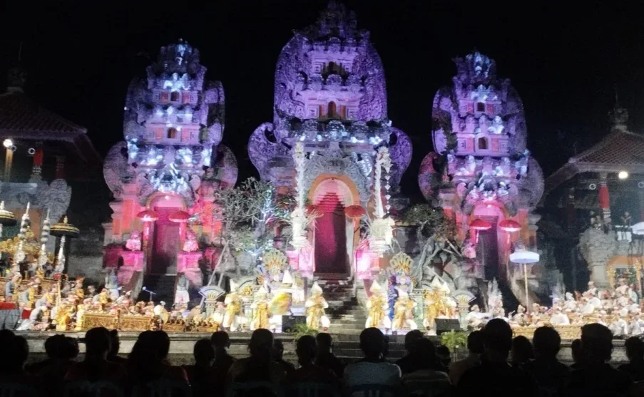 MANGUPURANEWS – GIANYAR, Ribuan masyarakat Gianyar terpukau menyaksikan pementasan Sekaa Gong Legend Kesuma Tirta Banjar Kawan Tampaksiring bersama Komunitas Seni Sundaram Banjar Kutuh Sayan Ubud di Open Stage Balai Budaya Gianyar, Senin (14/4). Selain memeriahkan HUT Kabupaten Gianyar, ini menjadi ajang pemanasan sebelum pentas pada Pesta Kesenian Bali (PKB) sebagai perwakilan Duta Kabupaten Gianyar.