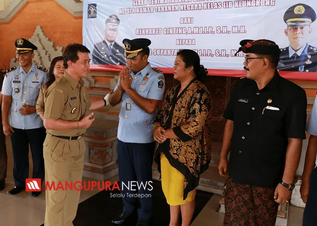 KLUNGKUNG, MANGUPURANEWS – Bupati Klungkung I Nyoman Suwirta bersama Wabup Made Kasta menghadiri acara serah terima jabatan dan pisah sambut Kepala Rumah Tahanan Negara Kelas II B Klungkung, di Balai Budaya Ida Dewa Agung Istri Kanya, Senin (13/1). Kepala rutan baru, I Made Supartana, A.Md.I.P., SH., M. H. yang sebelumnya bertugas di Bangkalan Madura, menggantikan Renharet Ginting A.Md.I.P., SH., M.H. yang menjabat sejak tahun 2017 untuk selanjutnya berpindah ke Rutan Kelas I Jakarta Pusat.