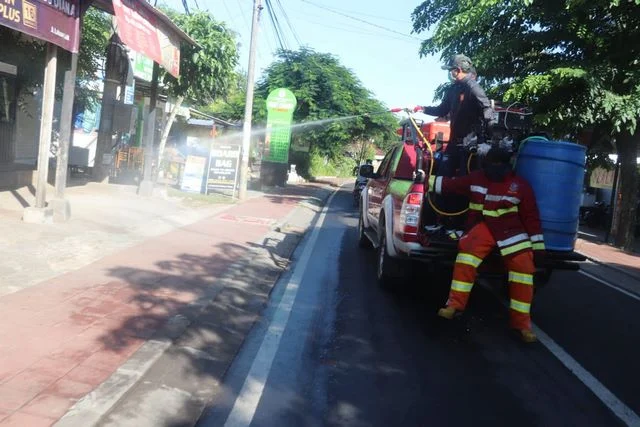 BADUNG, MANGUPURANEWS – Wakil Bupati Badung I Ketut Suiasa bersama Satgas Covid-19 Badung melakukan penyemprotan di Desa Adat Pecatu Kuta Selatan, Rabu (1/4). Penyemprotan disinfektan dilaksanakan bersinergi dengan aparat desa, masyarakat Desa Pecatu serta keamanan dari Babinsa dan Kepolisian serta Pecalang Desa Adat Pecatu. Penyemprotan dimulai dari lapangan Kuru Setra Pecatu dan terus dilanjutkan disepanjang Jalan Raya Uluwatu, Jalan Mangiat menuju Dreamland, sepanjang Jalan Bulgari hingga kepelosok gang-gang diperumahan penduduk. Dalam penyemprotan juga dikerahkan 4 kendaraan Dinas Kebakaran Water Conon serta satu kendaraan berukuran sedang yang diperuntukan untuk memasuki gang-gang kecil perumahan penduduk.