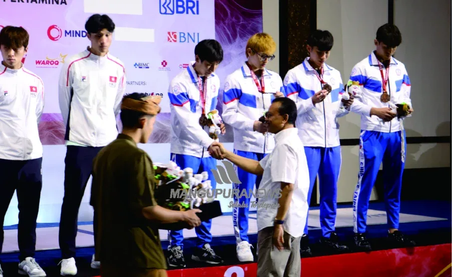 MANGUPURANEWS – BADUNG, Sekretaris Daerah Provinsi Bali, Dewa Made Indra, turut mendapat kehormatan untuk menyerahkan medali kepada para pemenang Asian Fencing Championships (AFC) 2025 yang digelar di International Convention Centre, Westin Resort Nusa Dua, Badung, Minggu (22/6). Kehadiran Sekda Dewa Made Indra yang mewakili Pemerintah Provinsi Bali sekaligus menegaskan komitmen daerah dalam mendukung olahraga prestasi bertaraf internasional.