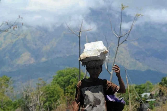Seorang warga di daerah Kubu, Karangasem masih beraktivitas, Senin (25/9), meski Gunung Agung sudah ditetapkan berstatus Awas.