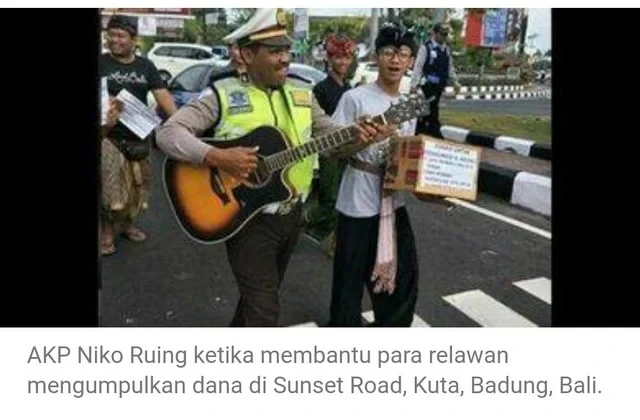 Uniknya, dalam aksi penggalangan donasi tersebut, seorang perwira polisi yang sedang bertugas mengatur lalu lintas ikut serta. Foto aksi AKP Niko Ruing yang sedang bermain gitar dengan didampingi para relawan viral di media sosial.