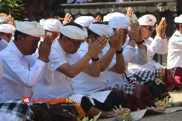 MENGWI, MANGUPURANEWS – Wakil Bupati Badung I Ketut Suiasa menghadiri sekaligus mengikuti prosesi Tradisi Tabuh Rah Pengangon (siat tipat bantal) yang dilaksanakan Desa Adat Kapal, Kelurahan Kapal, Kecamatan Mengwi di Pura Desa lan Puseh Kapal bertepatan dengan Purnama Kapat, Minggu (13/10). Wabup. Suiasa bersama Bendesa Adat Kapal I Ketut Sudarsana saling lempar tipat dan bantal dengan ibu-ibu PKK. Beliau berada di kelompok laki-laki yang melempar bantal sebagai simbul purusa (laki-laki) saling lempar dengan ibu-ibu PKK dengan membawa tipat simbul predana (perempuan). Tradisi yang digelar setiap tahun ini memohon kemakmuran masyarakat khususnya lahan pertanian.