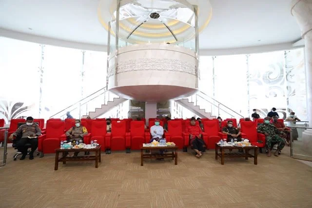 PUSPEM BADUNG, MANGUPURANEWS – Wakil Bupati Badung I Ketut Suiasa mengikuti Video Conference (Vidcon) Rapat Koordinasi bersama yang diselenggarakan Menkopolhukam Mahfud MD, Mendagri Tito Karnavian, Menkeu Sri Mulyani, Mensos Juliari Batubara, Mendes PDTT Abdul Halim Iskandar beserta kementrian terkait dengan Gubernur, Bupati / Walikota se-Indonesia terkait implementasi Pembatasan Sosial Berskala Besar (PSBB) di daerah dalam pencegahan penyebaran dan percepatan penanggulangan Covid-19 dari Gedung Comand Center Puspem Badung pada Kamis (9/4). Turut mendampingi Wakil Bupati diantaranya Ketua DPRD Badung Putu Parwata, Sekda Adi Arnawa, Kapolres Badung, Kapoltabes Denpasar, Kajari Badung, Dandim Badung dan Forkopimda Kabupaten Badung.